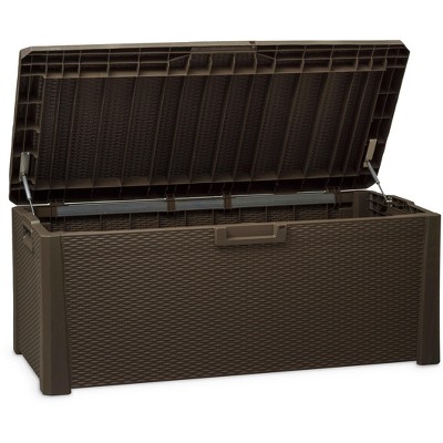 Introducing the new rubbermaid patio chic storage bench! Patio storage bench outdoor bench with storage deck box outside storage box storage box resin outdoor storage benches. Deck boxes & patio storage (16) sort by: The storage bench provides plenty of storage space inside for patio seat cushions, garden supplies or toys. The rubbermaid 1859930 outdoor deck box storage bench with dark teak basket weave design gives you great product performance with a great look.